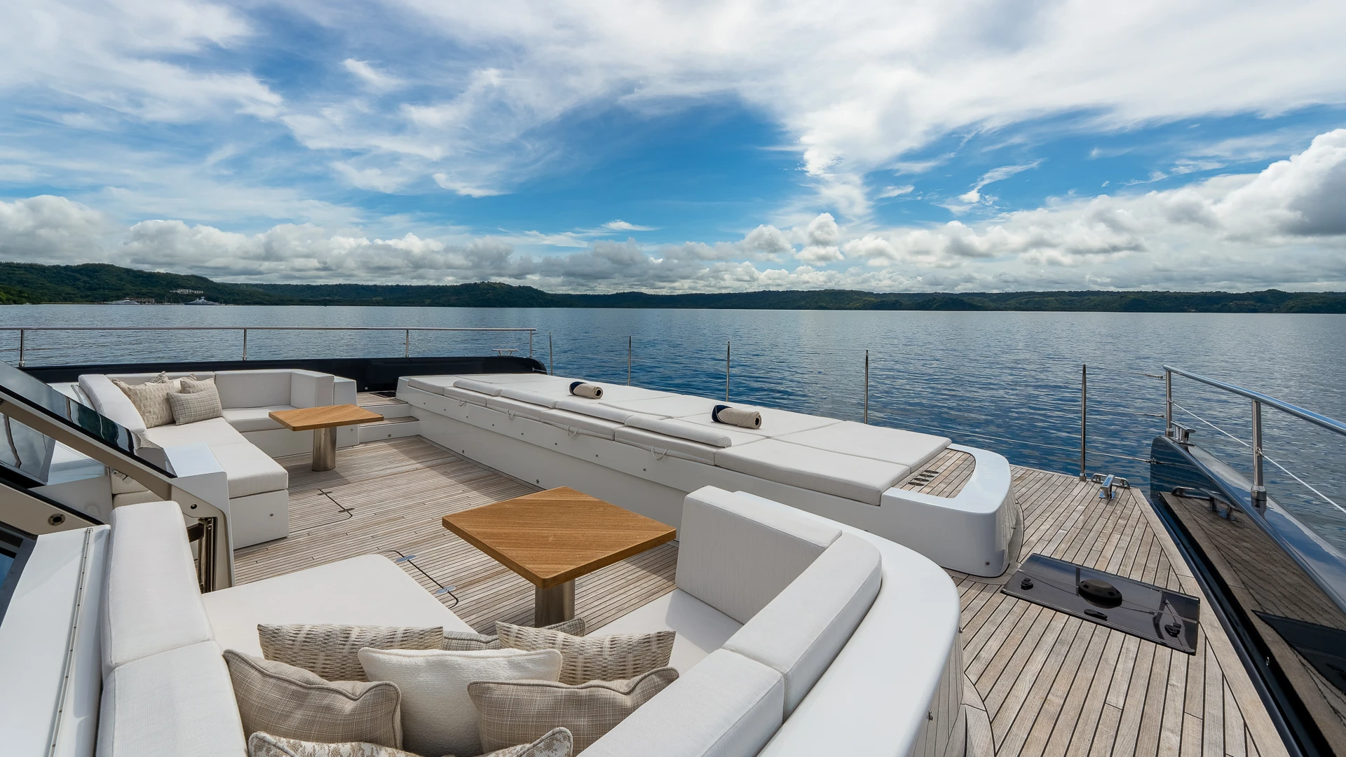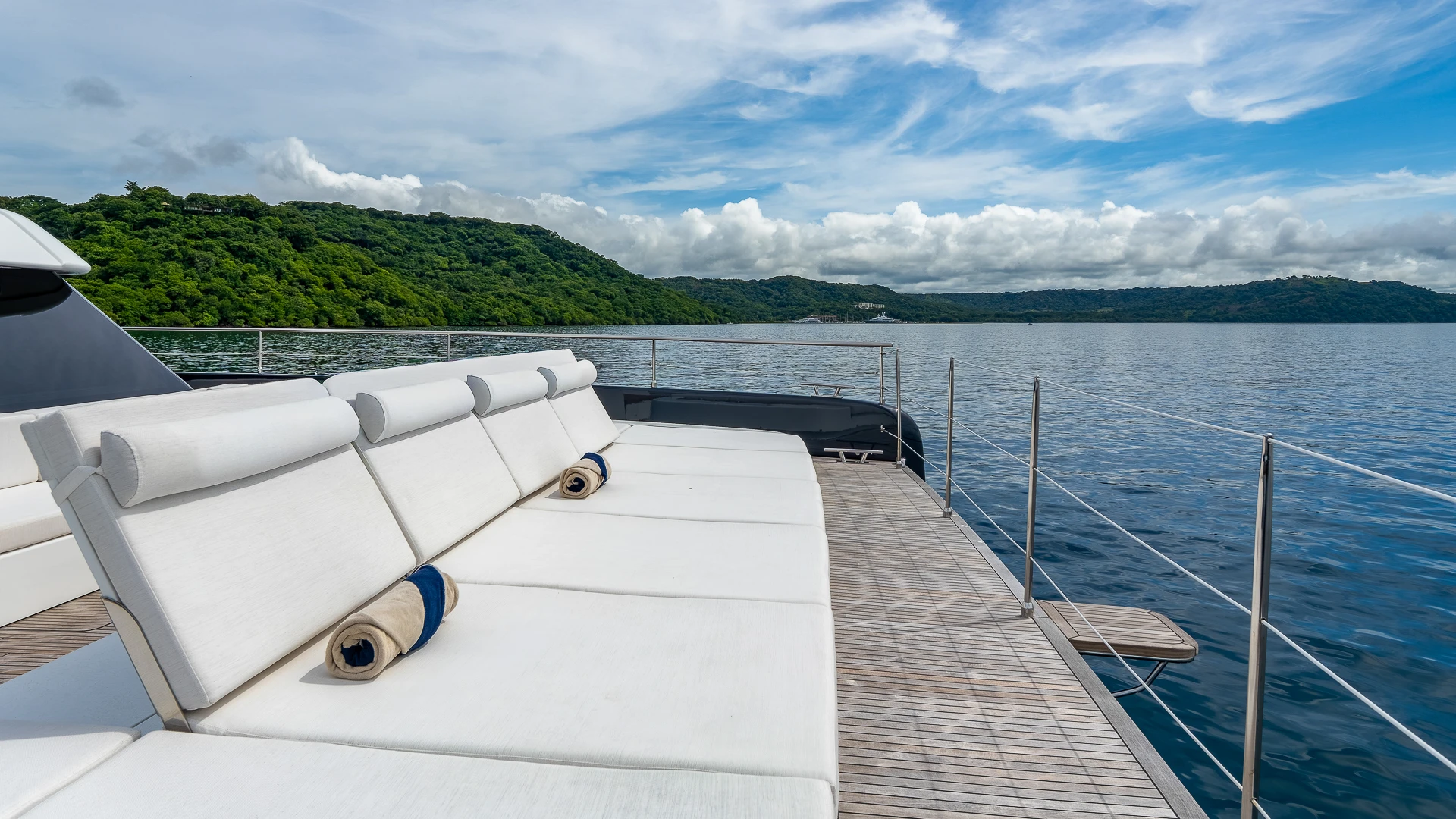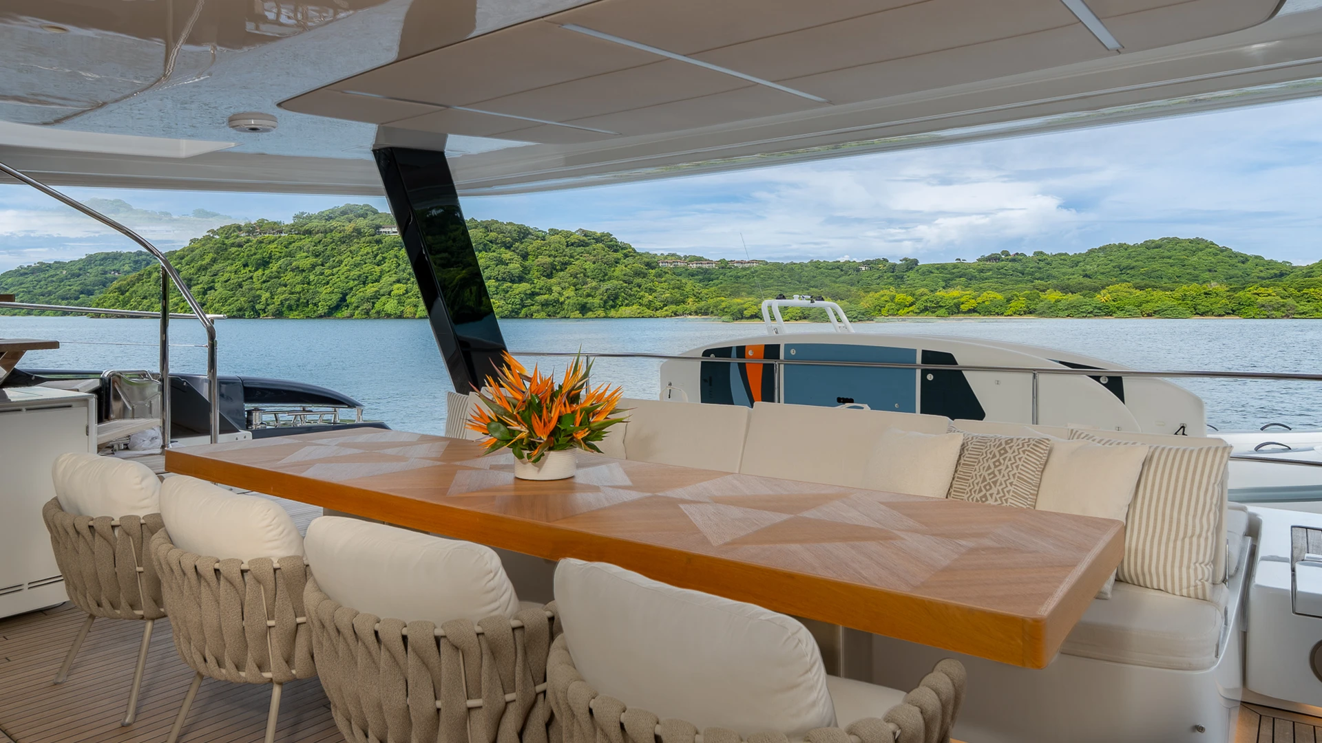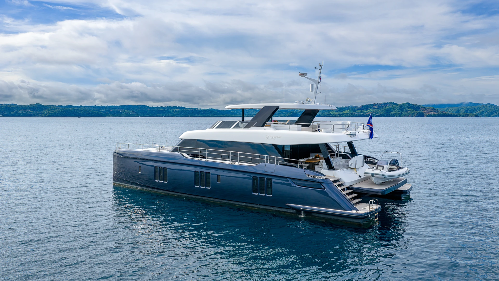 Her wide catamaran beam provides outstanding stability and generous volumes, with multiple indoor and outdoor living areas designed for life at sea. The flybridge features a jacuzzi and spacious lounging areas, offering panoramic views over Costa Rica’s dramatic coastline.