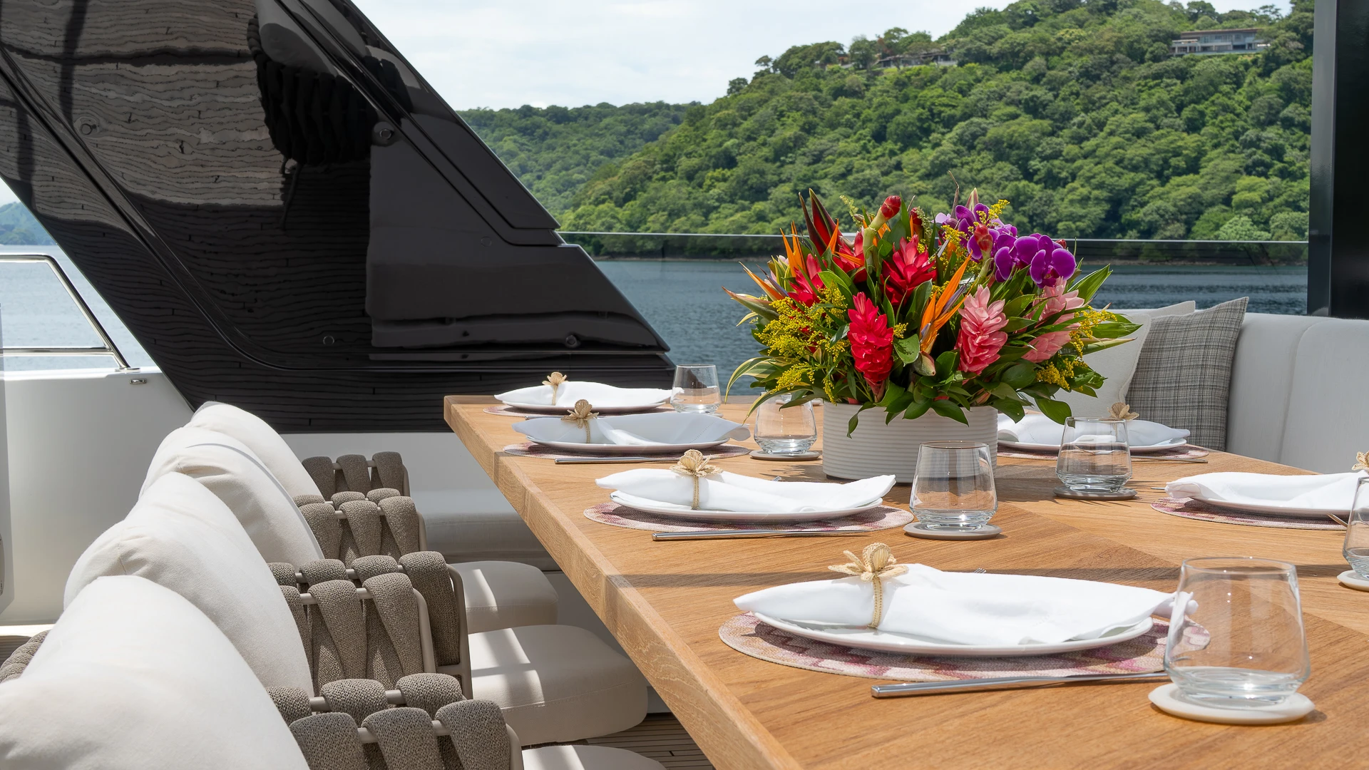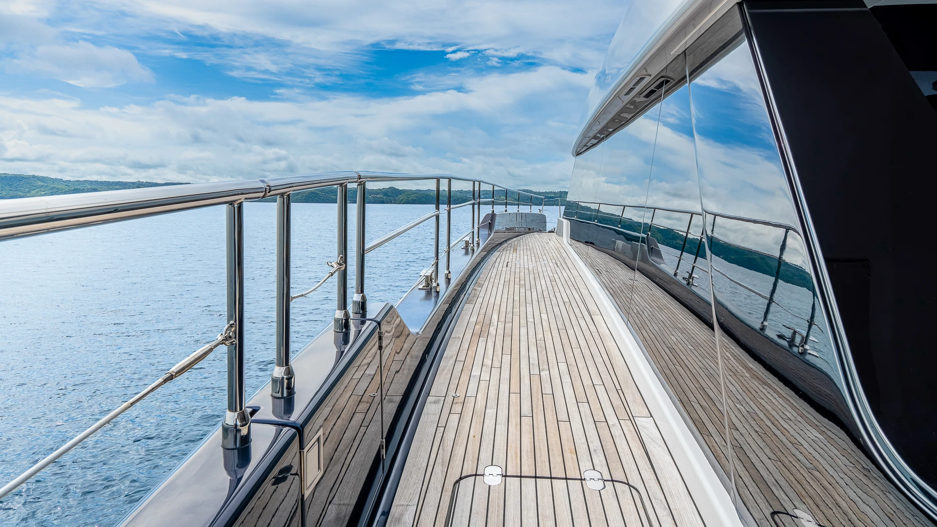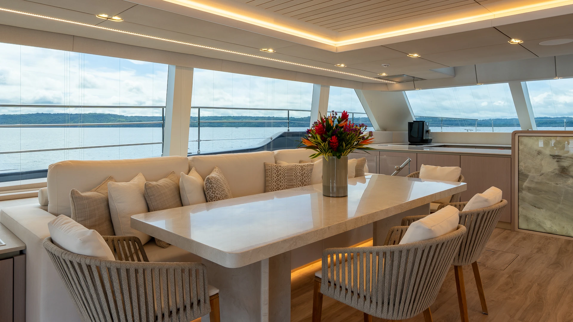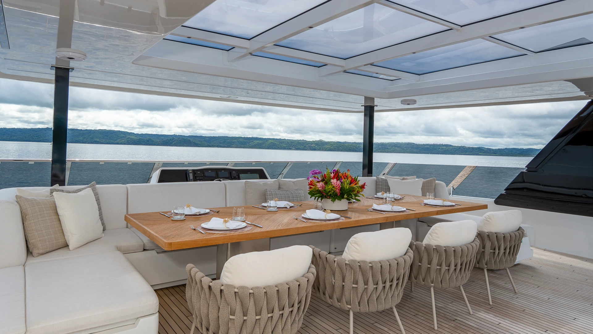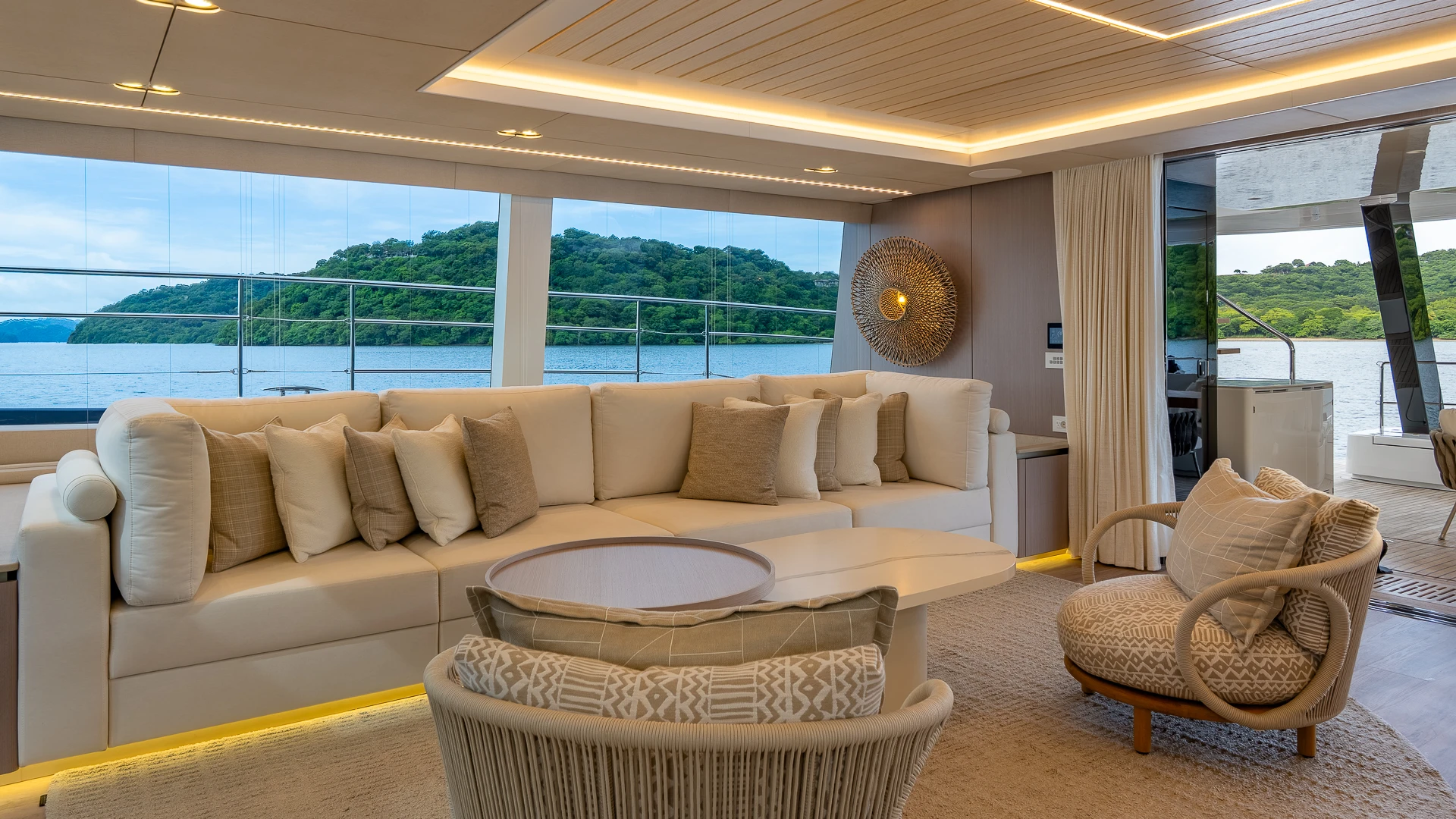 Her wide catamaran beam provides outstanding stability and generous volumes, with multiple indoor and outdoor living areas designed for life at sea. The flybridge features a jacuzzi and spacious lounging areas, offering panoramic views over Costa Rica’s dramatic coastline.